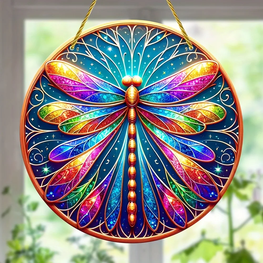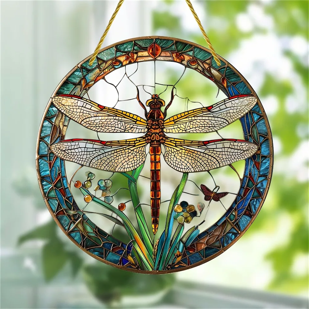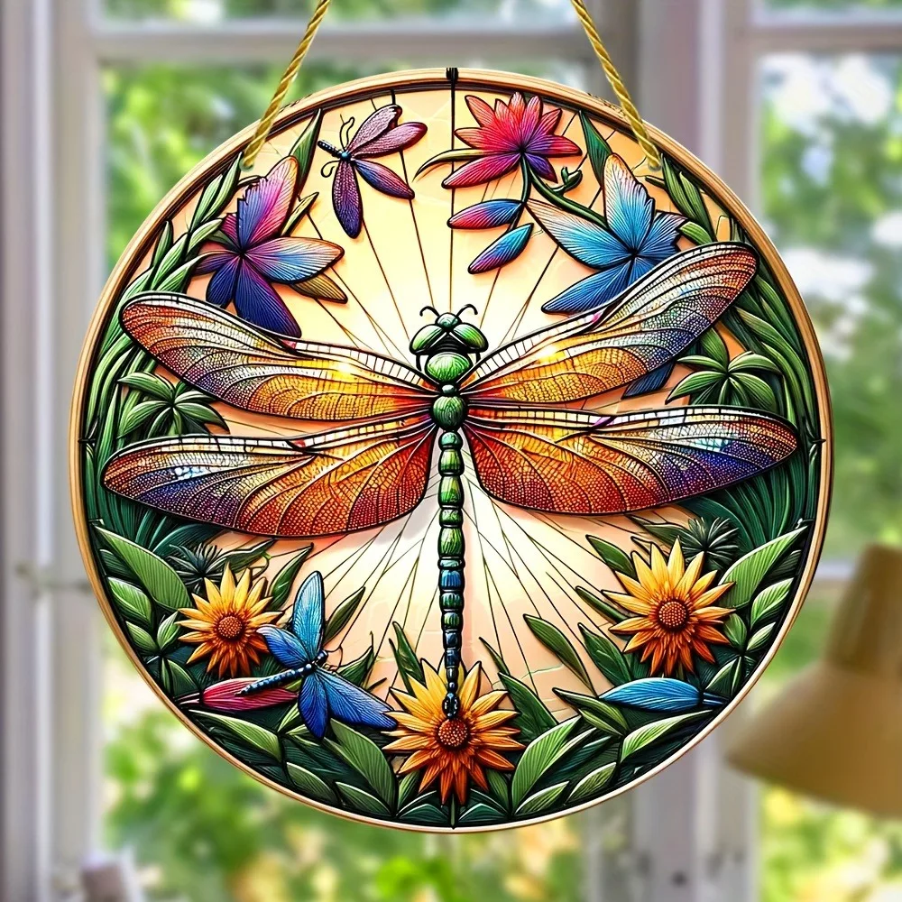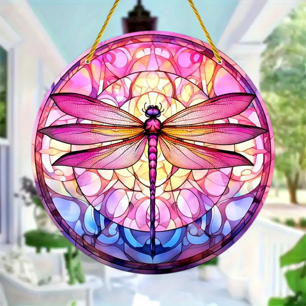 Dragonfly Suncatcher - Round Acrylic Wall Art, Stained -Style Window Hanging, Perfect For Bedroom & Living Room Decor